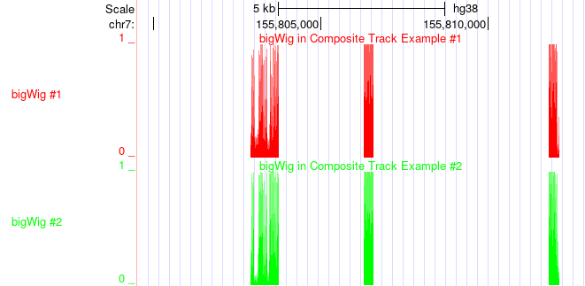 Here's what the configuration might look like for a composite containing two bigWig tracks. There are two key components of a composite: (1) the line "compositeTrack on" in the parent track stanza, and (2) including "parent compositeName" for each track that will be part of the composite.