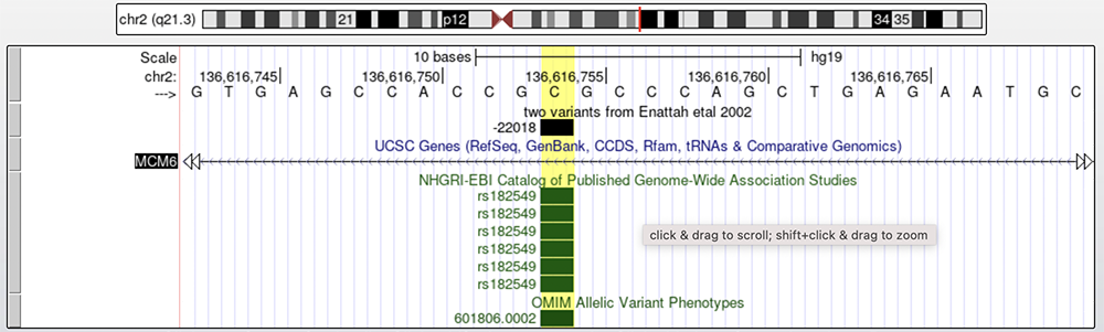 Figure 2a. MCM6 with two highlighted variants. A custom track labeled "two variants from Enattah etal 2002" show the coordinates, relative to the translation start of the LCT gene, of the variants in question. The "OMIM" and "GWAS" tracks are found below the "UCSC Genes" track, in respective order.