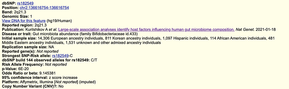 Figure 12. The GWAS page for rs182549, also known as -22018, continued. This report, from a different study, associates the SNV with gut microbiome composition.