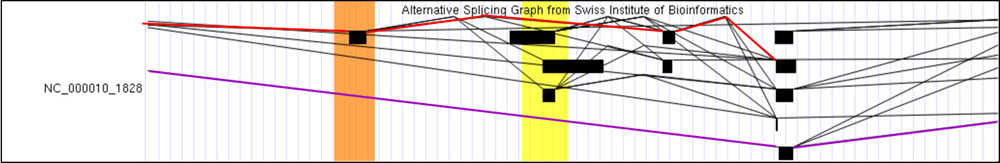 The next splicing data track "SIB Alt-Splicing", shows graphs constructed by analyzing experimental RNA transcripts and serves as the basis for the predicted alternative splicing transcripts shown in the SIB Genes track. In Figure 4 we can observe the "SIB Alt-Splicing" data track set to full for the FGFR2 gene. Here, the lines mark numerous possible spliced variants from registered RNA transcripts. Each line represents a recorded RNA splice event supported by a transcript and the exons it includes while a skipped exon implies that the exon was spliced out and not recorded in the transcript. Notice how in Figure 4, two separate colored lines include different exons within their path — representing the different spliced variant isoforms. The red line includes three exons while the purple line has skipped the first two exons that are included in the transcript in red.