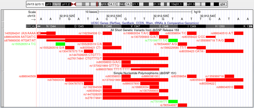 In Figures 1 and 2, the "UCSC Genes" track is displaying exon 11 of the BRCA2 gene. Below the "UCSC Genes" track are two "dbSNP" tracks, "dbSNP153" (upper) and "dbSNP151" (lower); these two tracks are different iterations of the same rsIDs and data, with some differences between the two data releases. The two tracks have different details available when clicking on one track or the other. Checking both versions of the rsID, or "reference SNP" can provide a wide range of insight into a variant.